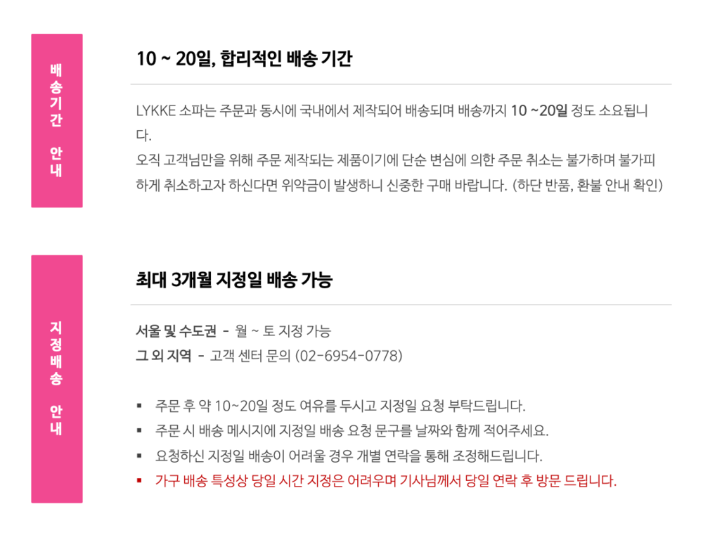 - 쇼룸 직접 수령 또는 용차 배송(비용 고객부담)